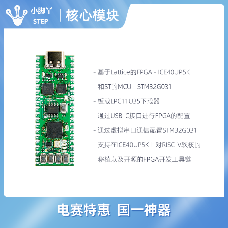 如何快速掌握這三項技能呢?我們思德普推出一個管腳兼容小腳丫FPGA的新款MCU +FPGA的核心模塊,采用帶有郵票孔的DIP40封裝,方便直接插在面包板上使用、插在DIP40的擴展板上,或者直接貼焊在自己畫的板子上。 這個核心板上用的是專為蘋果手機設計的一顆超低功耗但內部功能強大,尤其是內部存儲資源很大、兼有DSP功能的FPGA - iCE40UP5K,單片機采用的是ST最近兩年主推的G系列微控制器STM32G031,這二者的組合不僅方便初學者同時擁有