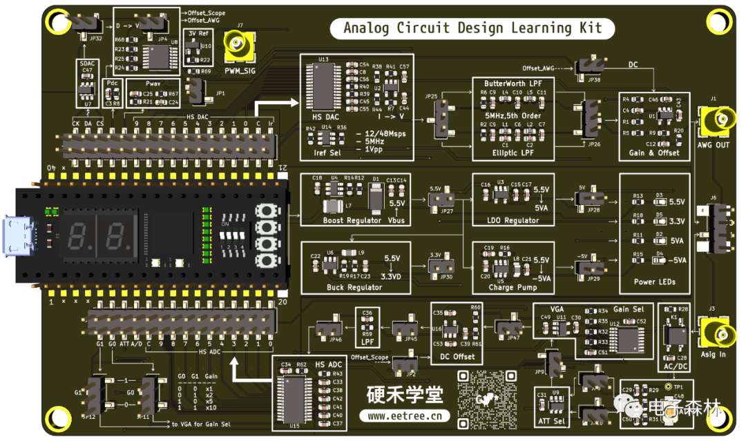 當前,FPGA的學習板基本都是數字系統的 - 搭配按鍵、顯示屏、傳感器,做點邏輯控制、顯示、網絡、數字信號處理等方面的編程等。很少看到數字 + 模擬混合在一起的綜合系統學習套件。 對于渴望學習模擬電路的同學、工程師來講,只是做一些獨立模塊的設計、測試而學習和掌握到的知識點都是支離破碎的。無系統、不模擬!只有在一個綜合性的系統應用中,才能深刻理解模擬電路的精髓。 為此,我們專為小腳丫FPGA核心板設計了一款幾乎包含了所有主要模擬器件功能的“模擬電路設計學習套件”,以高速信號發生器和高速數據采集為