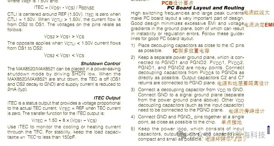 在以集成芯片為核心的TEC控制應用中,我們簡要探討了 PID反饋控制設計和PCB布局設計的關鍵性。PID設計可參考典型案例,并結合實際樣板結果進行精細調試。而PCB布局方面,則需特別關注大功率回路的隔離、散熱以及電磁干擾(EMI)的防范措施。