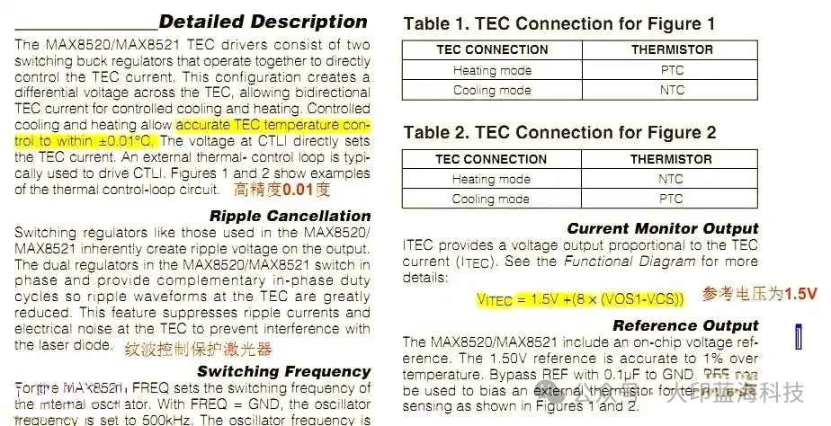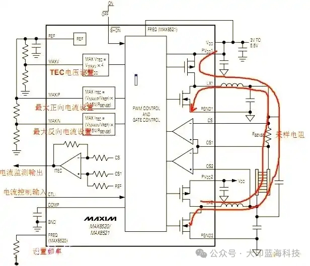 那么,如何才能有效地驅動TEC以實現精確的溫度控制呢?讓我們以一款集成了TEC控制芯片的產品為例,來探討一下TEC的驅動控制原理。這款產品采用的是 MAX8520集成芯片,其驅動電流為1.5A,驅動方式與電機的驅動頗為相似。