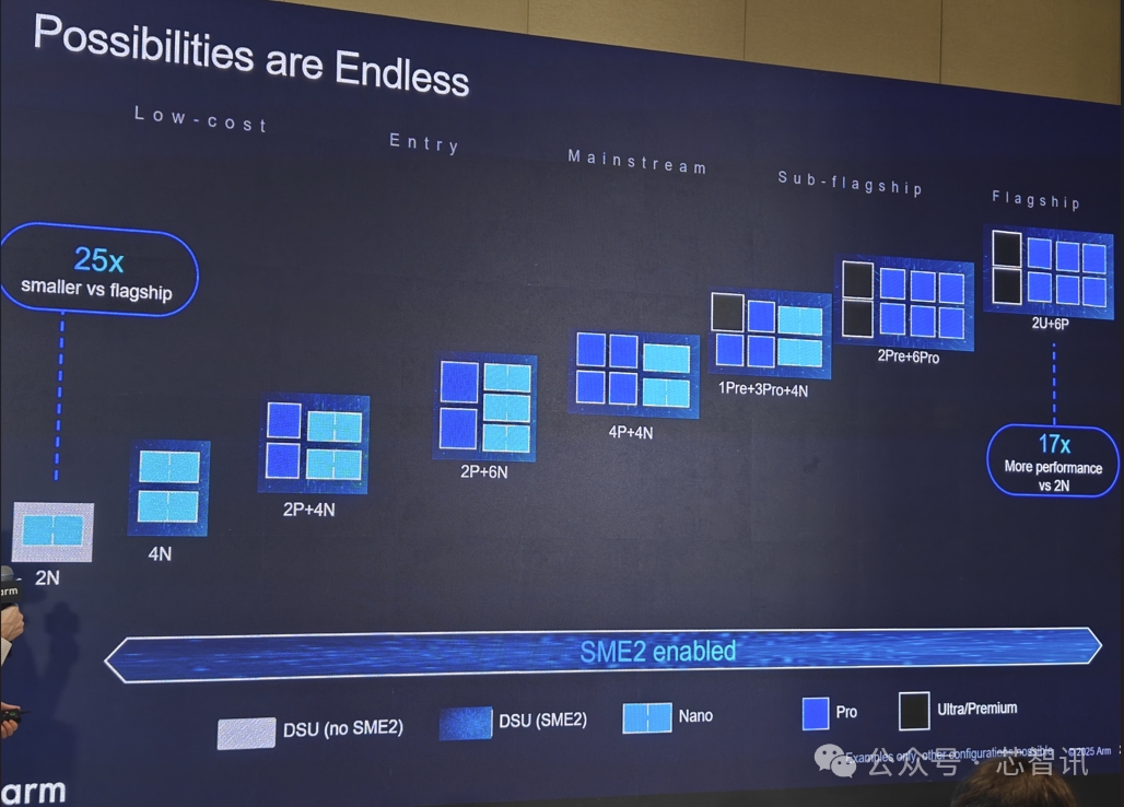 如果拿最低端的2個C1-Nano(基于不支持SME2的DSU)與最高端的2個C1-Ultra + 6個C1-Pro(基于支持SEM2的DSU)對比,后者的性能達到了前者的17倍,不過面積也達到前者的25倍。足見性能、面積跨度之大,還可擴展至各個級別的消費類電子和移動設(shè)備,為多樣化的端側(cè)工作負載提供不同水平的性能、功耗和面積效率。