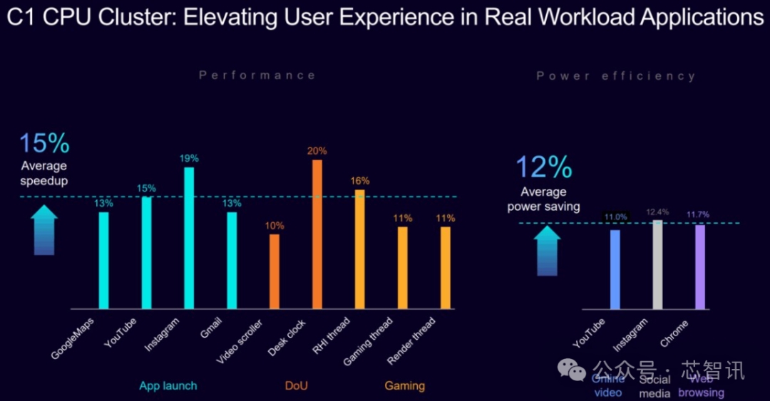 Arm C1 CPU 集群在實際用例中表現(xiàn)突出。在行業(yè)領(lǐng)先的性能基準測試,該 CPU 集群在同等條件下,相較于上一代 CPU 集群性能平均提升 30%,在游戲和視頻流媒體等應用中平均提速 15%。與此同時,在日常移動端工作負載(如視頻播放、社交媒體、網(wǎng)頁瀏覽)中,該 CPU 集群在同等條件下,相較于上一代 CPU 集群功耗平均降低 12%。