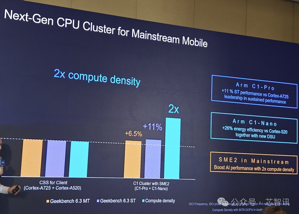 在Arm看來,下一代主流的智能手機的CPU集群可能將會是支持SME2的C1集群,比如C1-Pro + C1-Nano這樣的組合,預計相比當前的Cortex-A725+Cortex-A520的組合,可以帶來11%的性能提升和2倍的AI性能密度。