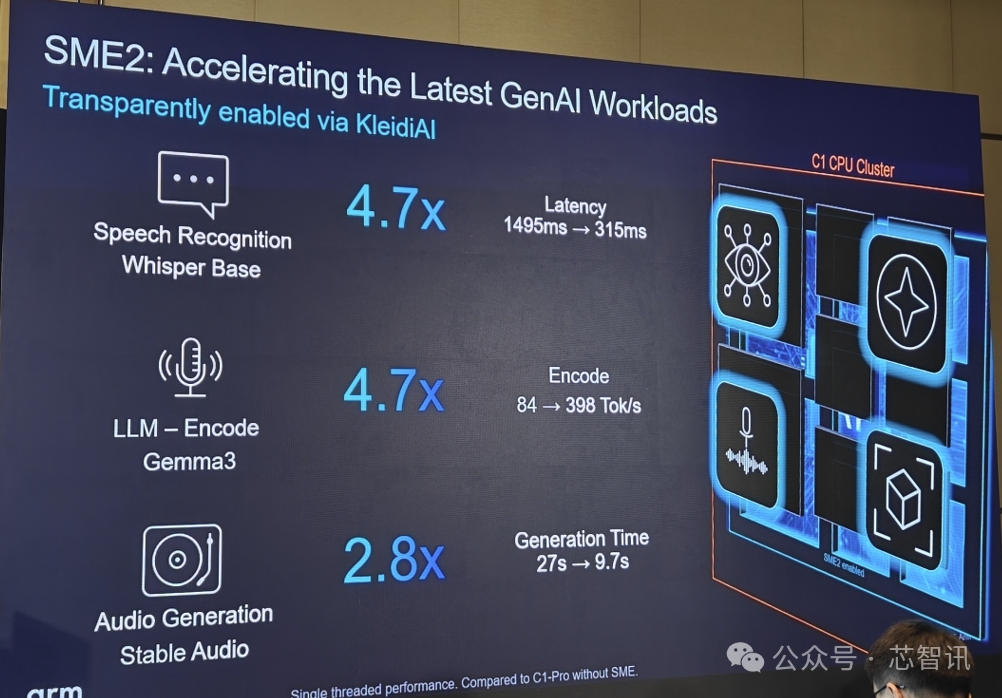 得益于 SME2 內(nèi)置的矩陣擴展,Arm C1 CPU 能夠加速 AI 功能,包括涉及大量矩陣運算的大語言模型 (LLM)、媒體處理(圖像與視頻)、語音識別、計算機視覺、實時應用(AI 助手、計算攝影與 AI 濾鏡)以及多模態(tài)應用等。SME2 是在 SME 基礎(chǔ)上進行了全新的智能升級,能提升性能、降低內(nèi)存占用,并使端側(cè) AI 運行得更為流暢,尤其是在音頻生成、攝像頭推理、計算機視覺及即時聊天等高實時性要求的應用中。