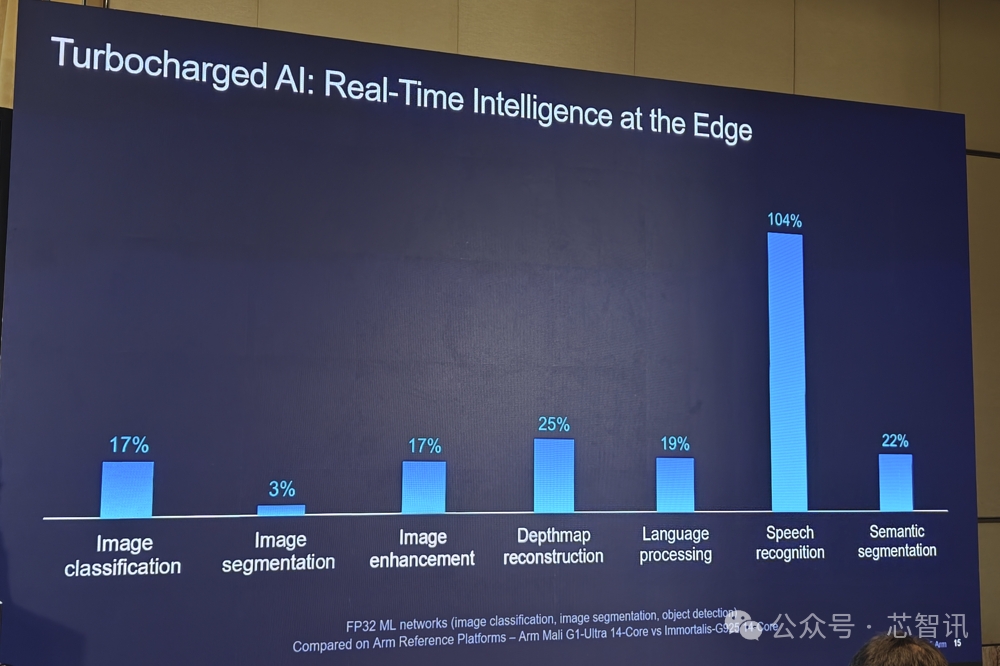 AI 正在重塑移動設(shè)備思考、感知與響應的方式,而 GPU 在這一演進歷程中扮演著關(guān)鍵角色。Mali G1-Ultra 引入新的矩陣乘法單元 (MMUL) FP16 指令,可加速如語義分割、去噪、深度估計、物體檢測、語音識別和圖像增強等端側(cè)關(guān)鍵 AI 工作負載。在FP32 ML網(wǎng)絡中,Mali G1-Ultra與上一代 Immortalis-G925(同樣均為14核心)相比,其性能提升高達 104%。