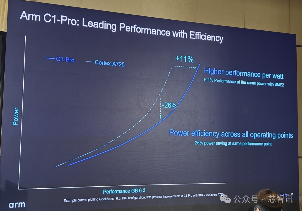 從Geekbench 6.3測試表現(xiàn)來看,在同等性能下,C1-Pro的功耗要比Cortex-A725低26%;在同等功耗下,C1-Pro的性能要比Cortex-A725高出11%。