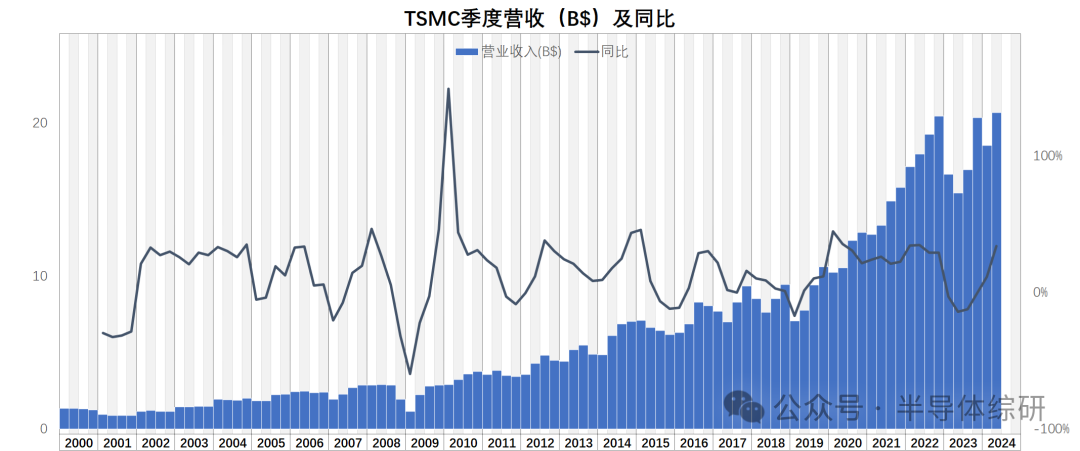 最近一段時間,雖然半導體行業已經明確走出谷底,但反彈力度不足,整個行業的景氣度依舊不高。所以不少朋友也不斷和我探討行業后續的發展究竟會如何變化 要了解透半導體行業的現狀和未來,我們需要觀察和分析的數據是非常多的。不過,從宏觀角度上看,我首先會建議所有人先自己研究一下兩家晶圓代工廠的財務數據: 第一家自然就是臺積電(TSMC)。作為行業絕對的龍頭,他的營收基本代表了半導體行業整體的態勢。尤其在高端工藝,臺積電處于完全壟斷狀態。他的高端工藝的財務數據直接代表了先進產品的行情 第二家則是臺聯電